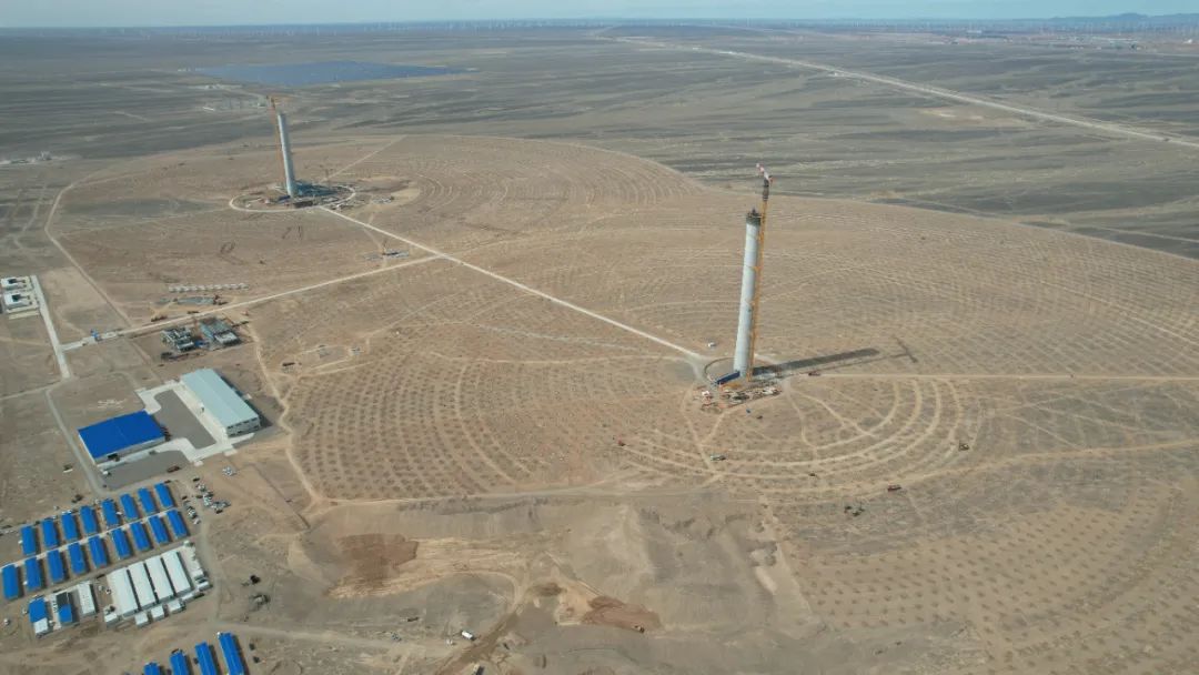近日,位于甘肃省瓜州县的全球首个“双塔一机”风光热储一体化项目——三峡恒基能脉瓜州70万千瓦“光热储能+”项目东西双塔全面封顶。东西距离1公里的两座吸热塔比肩而立,73台风机、48897个光伏组件支架基桩、26954块定日镜安装…